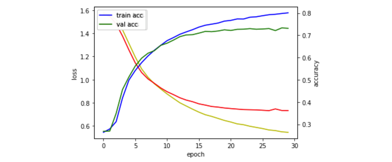 43903/43903 [==============================] - 2s 34us/sample - loss: 1.5529 - accuracy: 0.2856 - val_loss: 1.5353 - val_accuracy: 0.3269