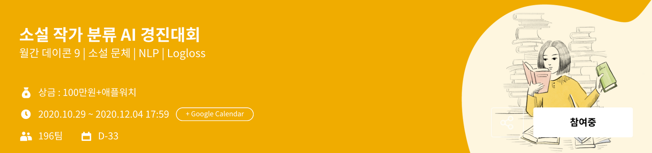 | [DACON] 소설 작가 분류 AI 경진대회 도전! (0) | 2020.10.31 |