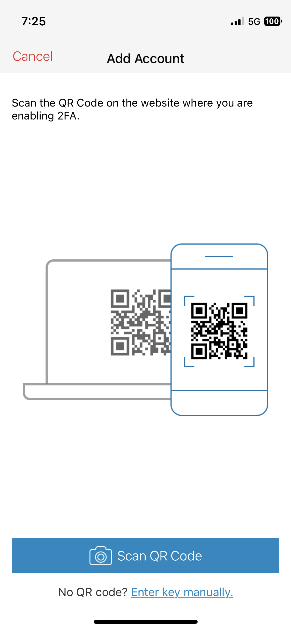 설치한 앱에서 Add Account 를 클릭하고 Scan QR Code 를 클릭하여 화면에 나와있는 QR 코드를 인식하면