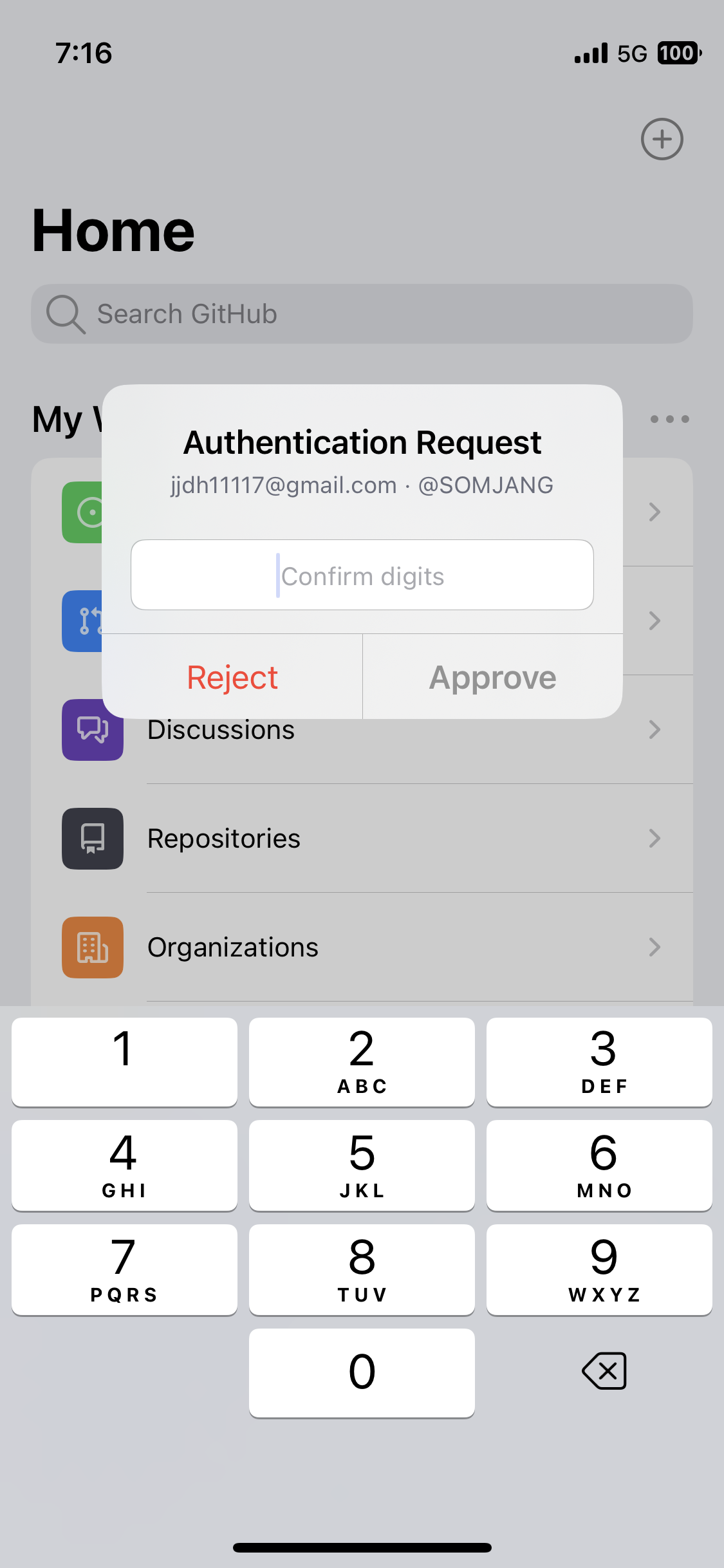 그럼 핸드폰 GitHub 앱을 열고 해당 번호를 입력한 뒤 Approve 를 클릭하면 됩니다.
