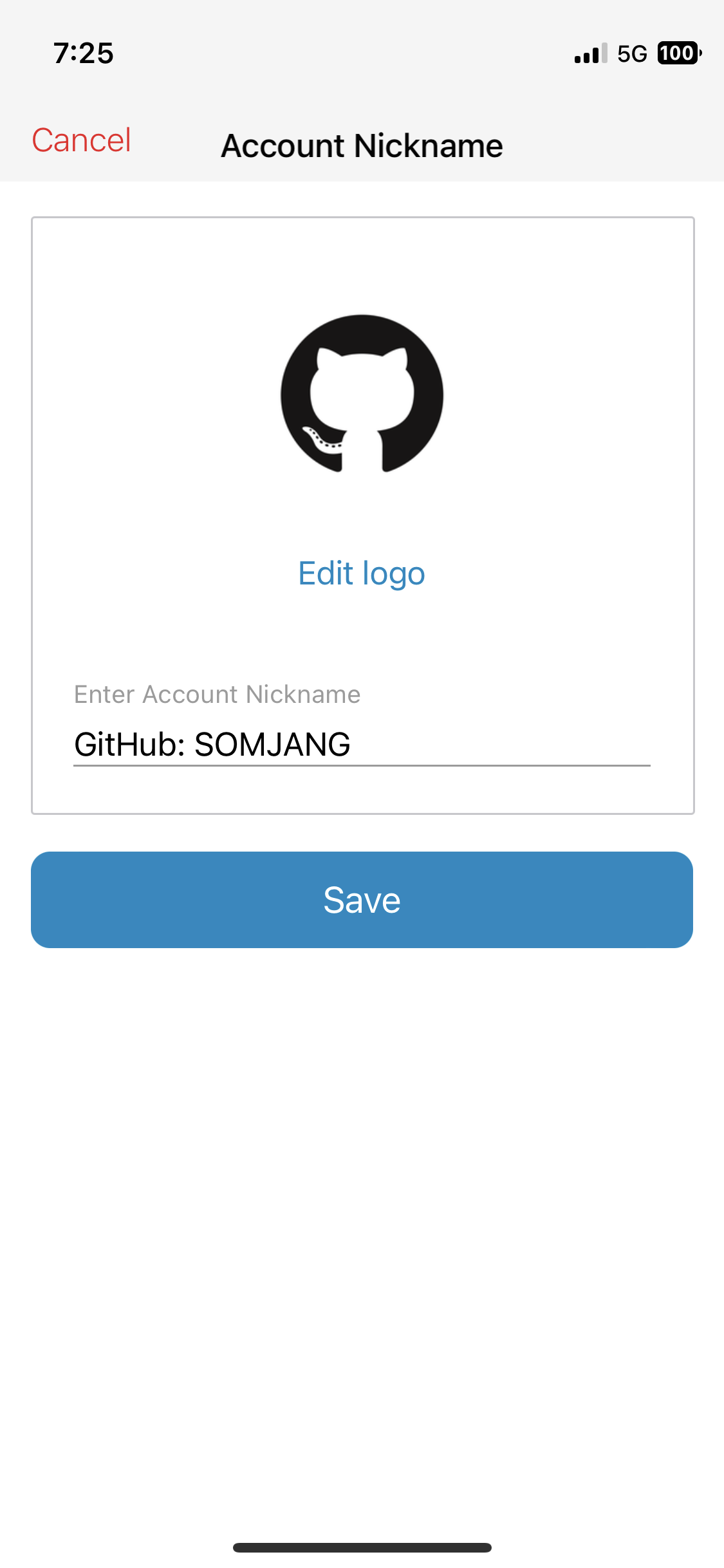 맨 오른쪽 사진과 같이 GitHub 임이 인식 되고 로고와 닉네임을 설정하고 저장하는 화면이 나옵니다.