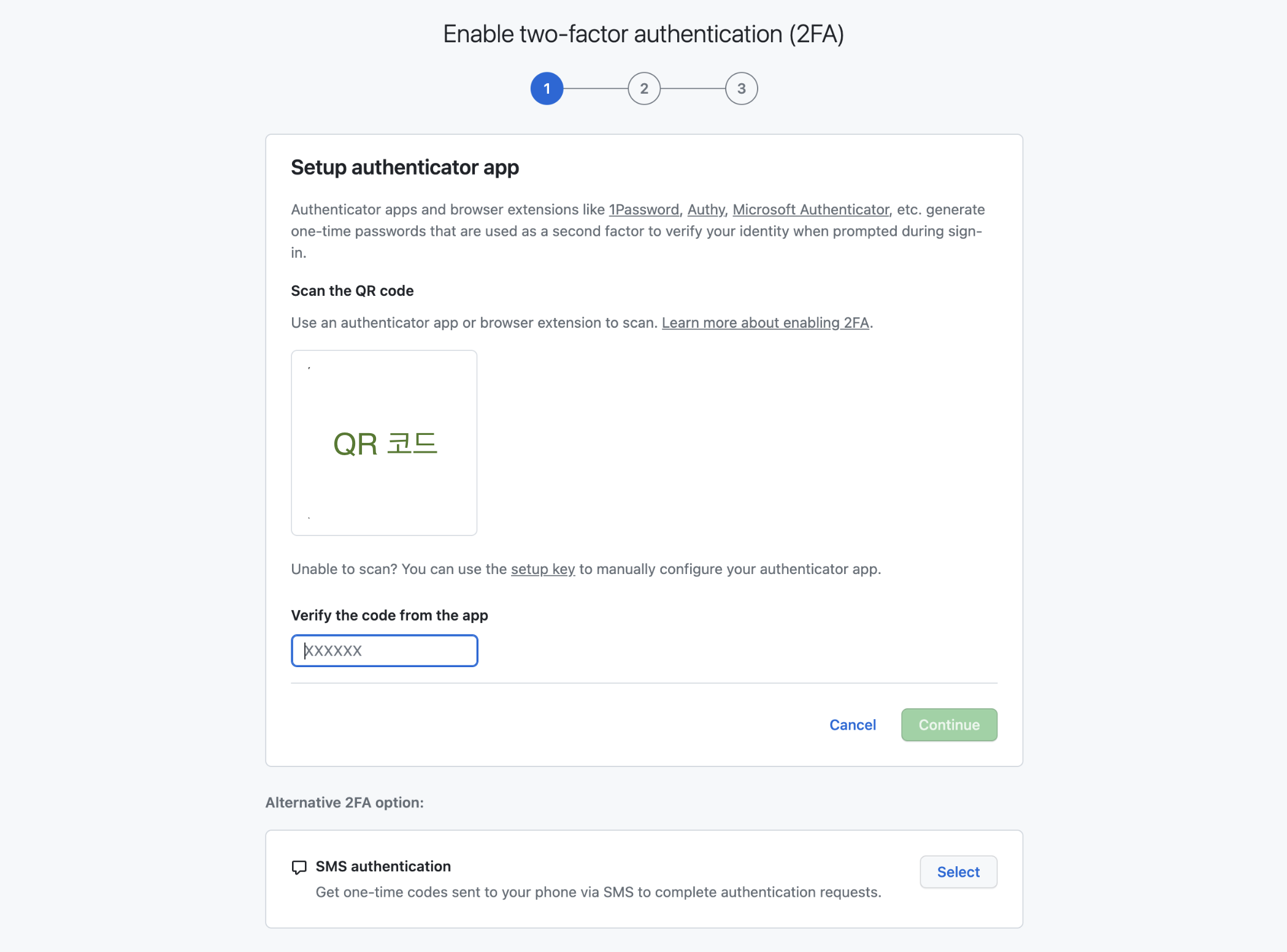 위와 같이 Two-factor authentication (2FA) is required for your Github accout 화면이 나오면서