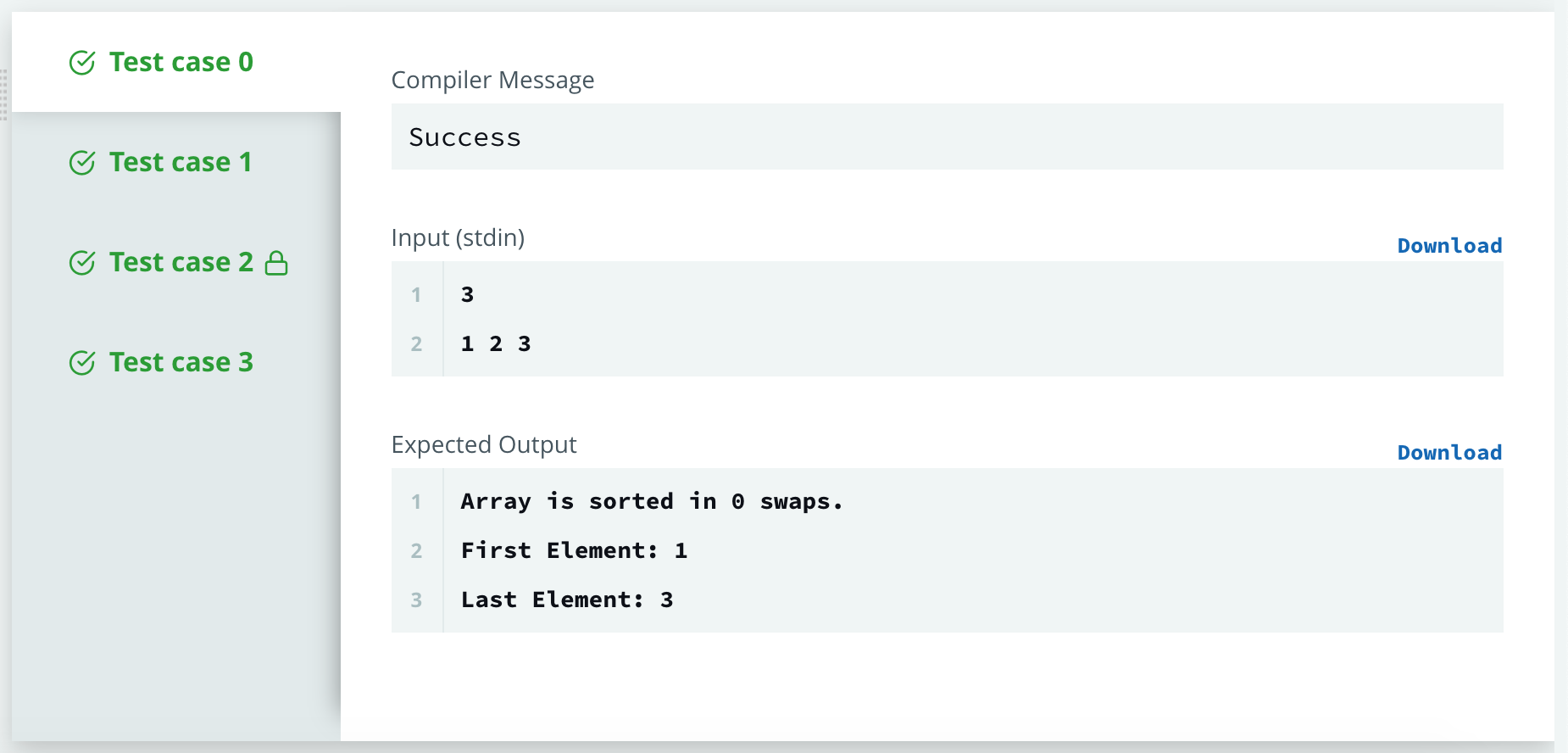 The array is already sorted, so 0 swaps take place and we print the necessary three lines of output shown above.
