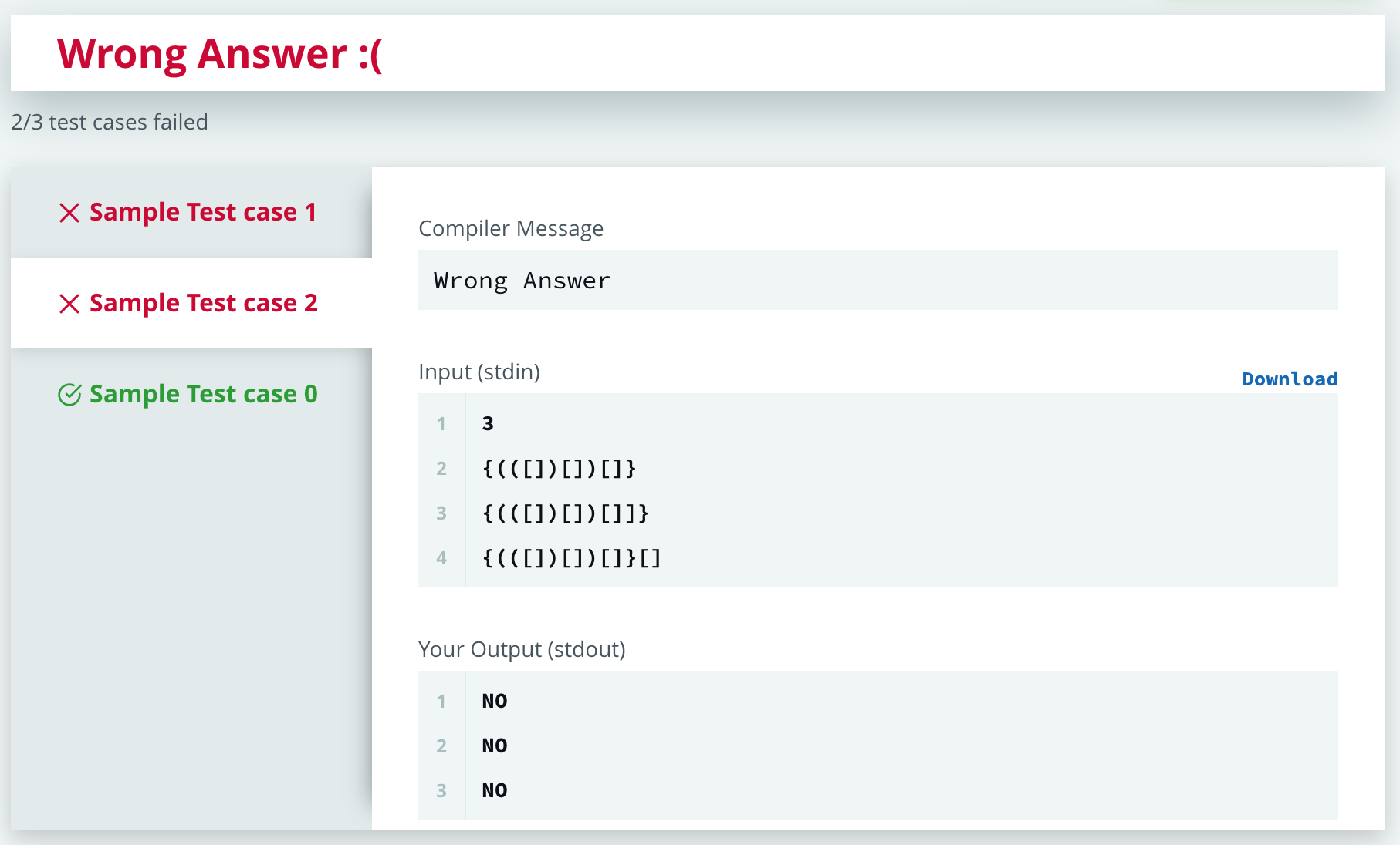 하지만 이렇게 코드를 짜서 제출하면 { ( ( [ ] ) [ ] ) [ ] } 와 같은 괄호는 찾을 수 없습니다.