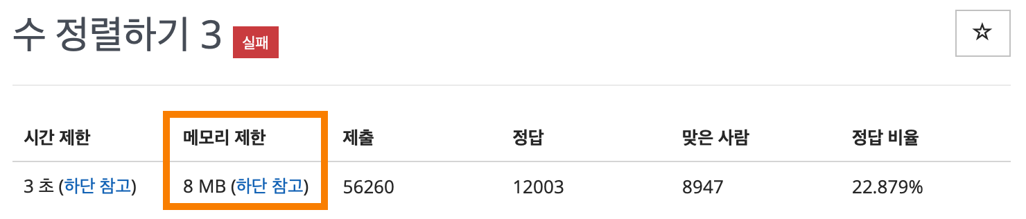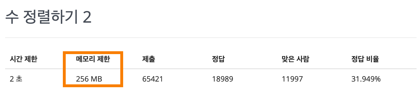 수 정렬하기 2의 메모리 제한은 256MB였고 수 정렬하기 3의 메모리 제한은 8MB인것을 알 수 있었습니다.