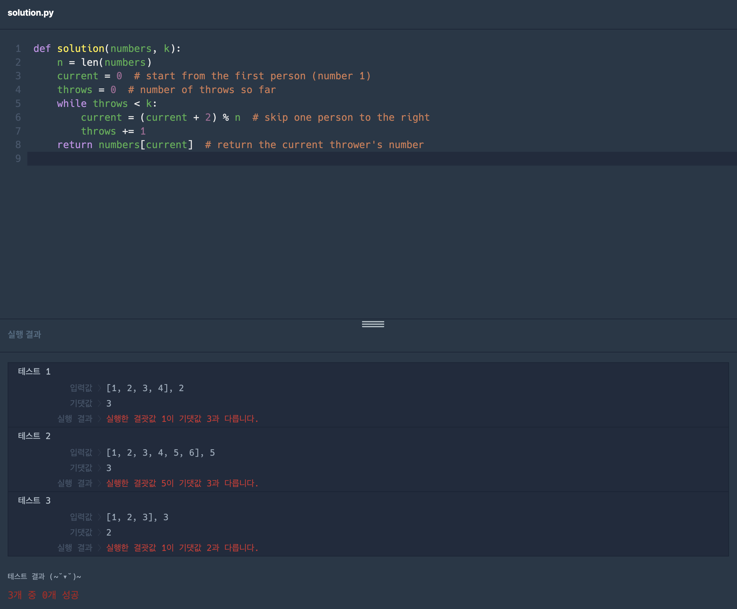 위 코드에서 extended_numbers는 원형으로 이루어진 배열에서 인덱스를 계산하기 위해, numbers 배열을 두 번 이어붙인 배열입니다. current_idx는 현재 공을 던지는 사람의 인덱스를 나타내며, for 루프를 돌면서 인덱스를 계산하고, current_idx == 0이 되면 마지막 번호 다음에 다시 첫 번째 번호가 오게 됩니다. 마지막으로, 계산된 인덱스에 해당하는 사람의 번호를 리턴하면 됩니다.