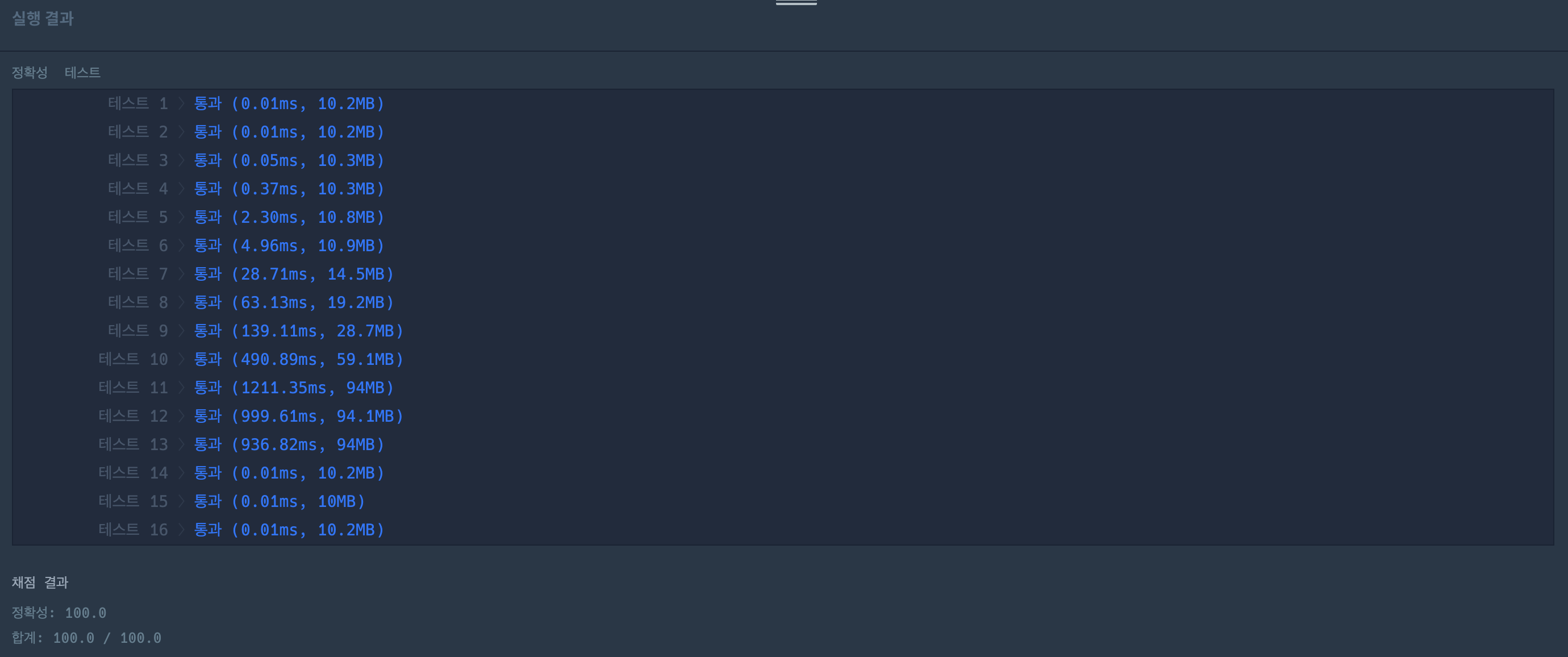 정답도 성능도 모두 틀렸습니다. 다시 풀어주세요.