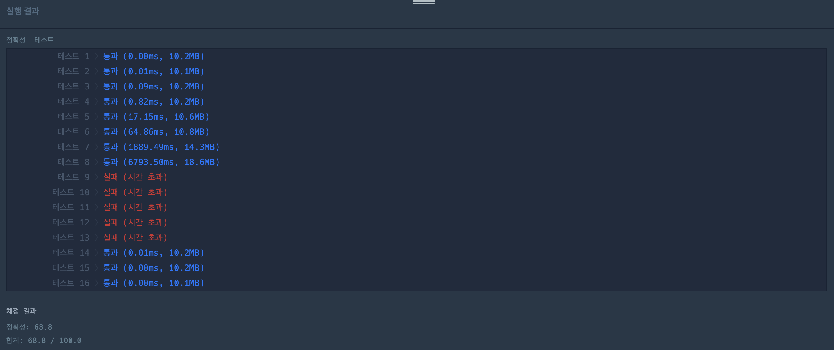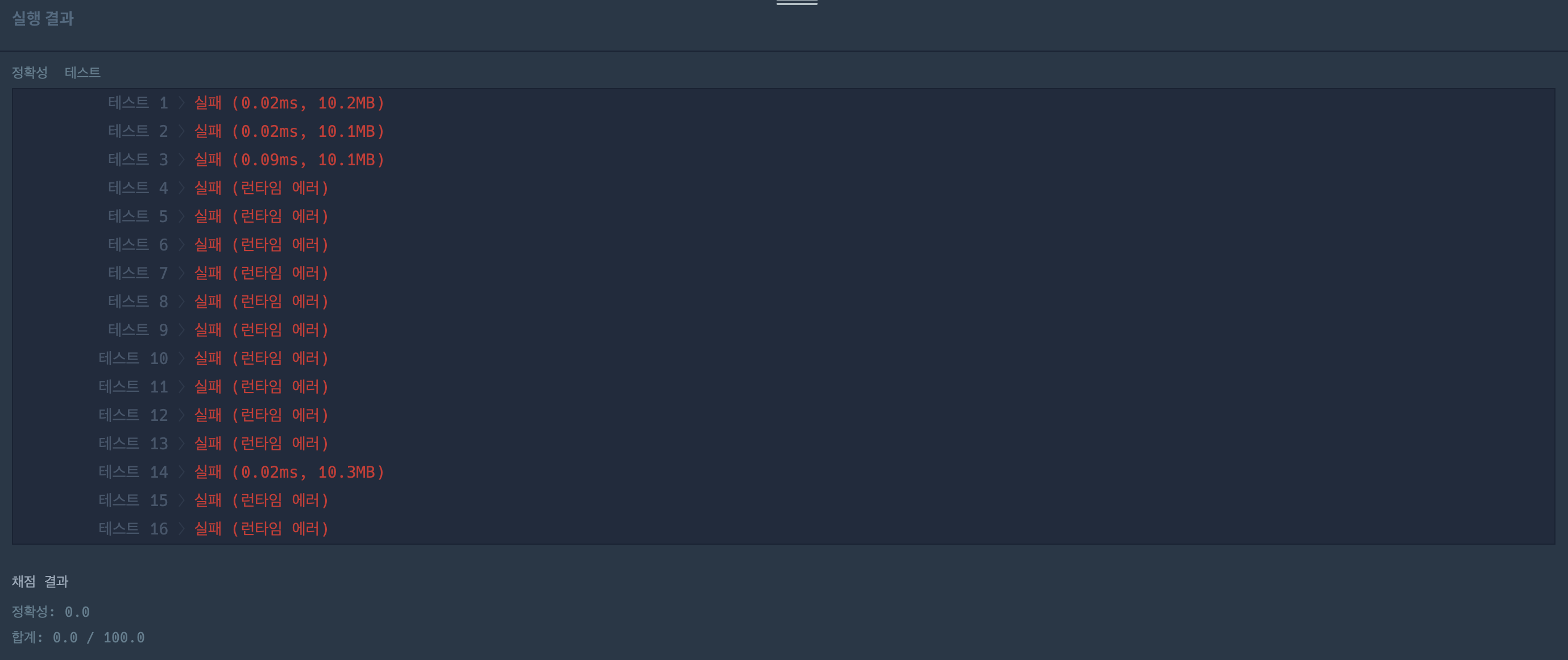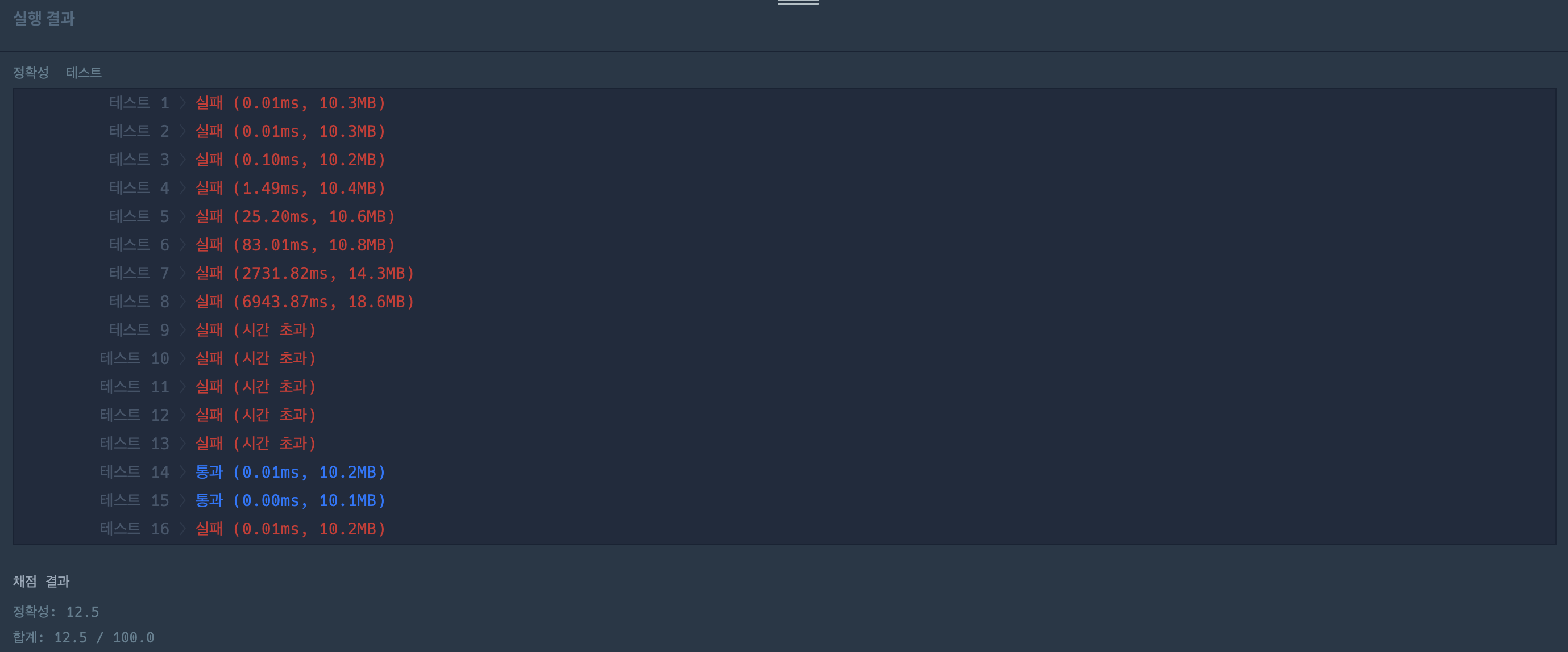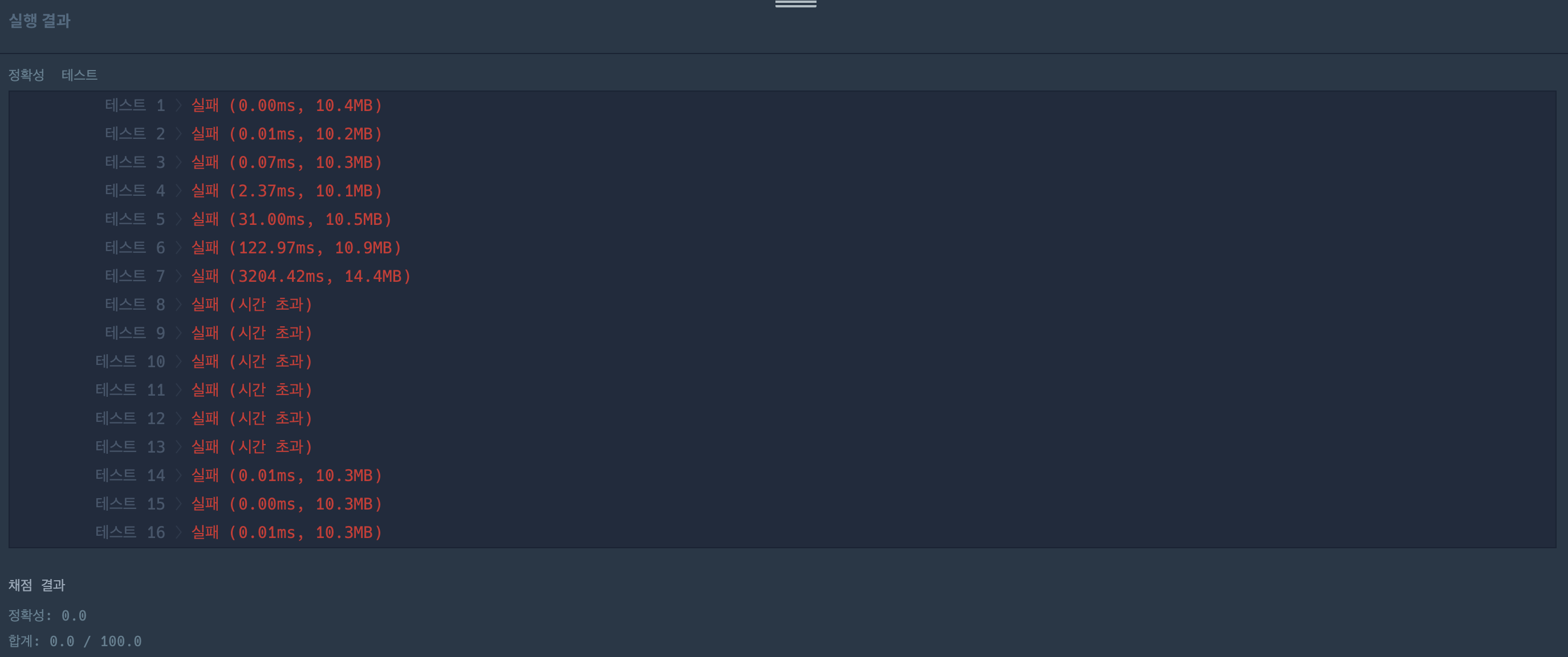 정답도 성능도 모두 틀렸습니다. 다시 풀어주세요.