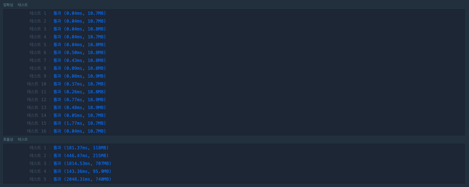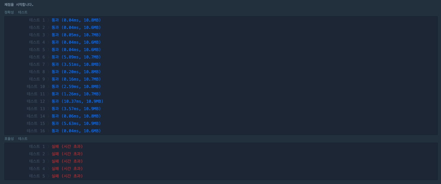 정확성에서는 제대로 결과가 나왔지만 효율성에서는 시간초과라는 결과가 나왔습니다.