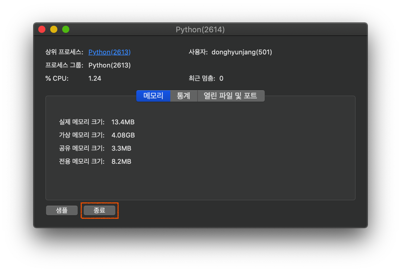 터미널 사용이 어려운 분들은 Mac OS에 기본으로 제공되는 활성상태보기를 활용하시면 됩니다.