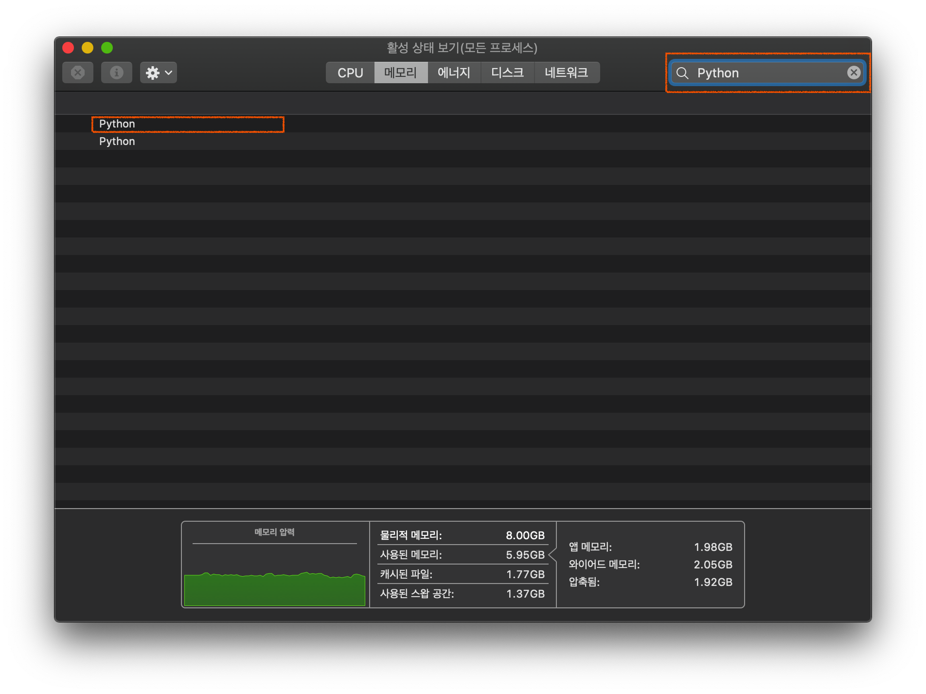 여기서 Python을 검색하면 현재 실행되고 있는 프로세스 2개가 나오게됩니다.