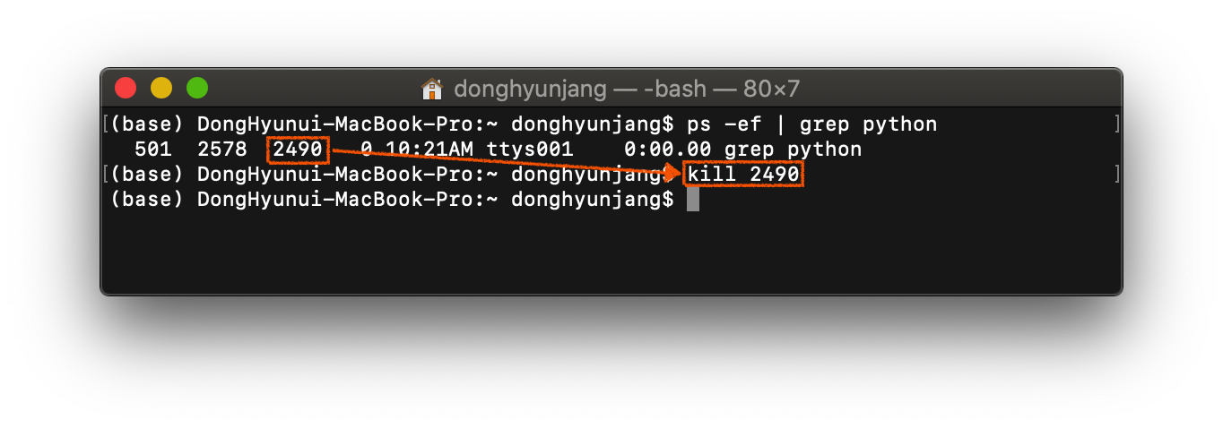 위처럼 명령어를 통해 PID 값 (주황색 네모) 을 알아내고