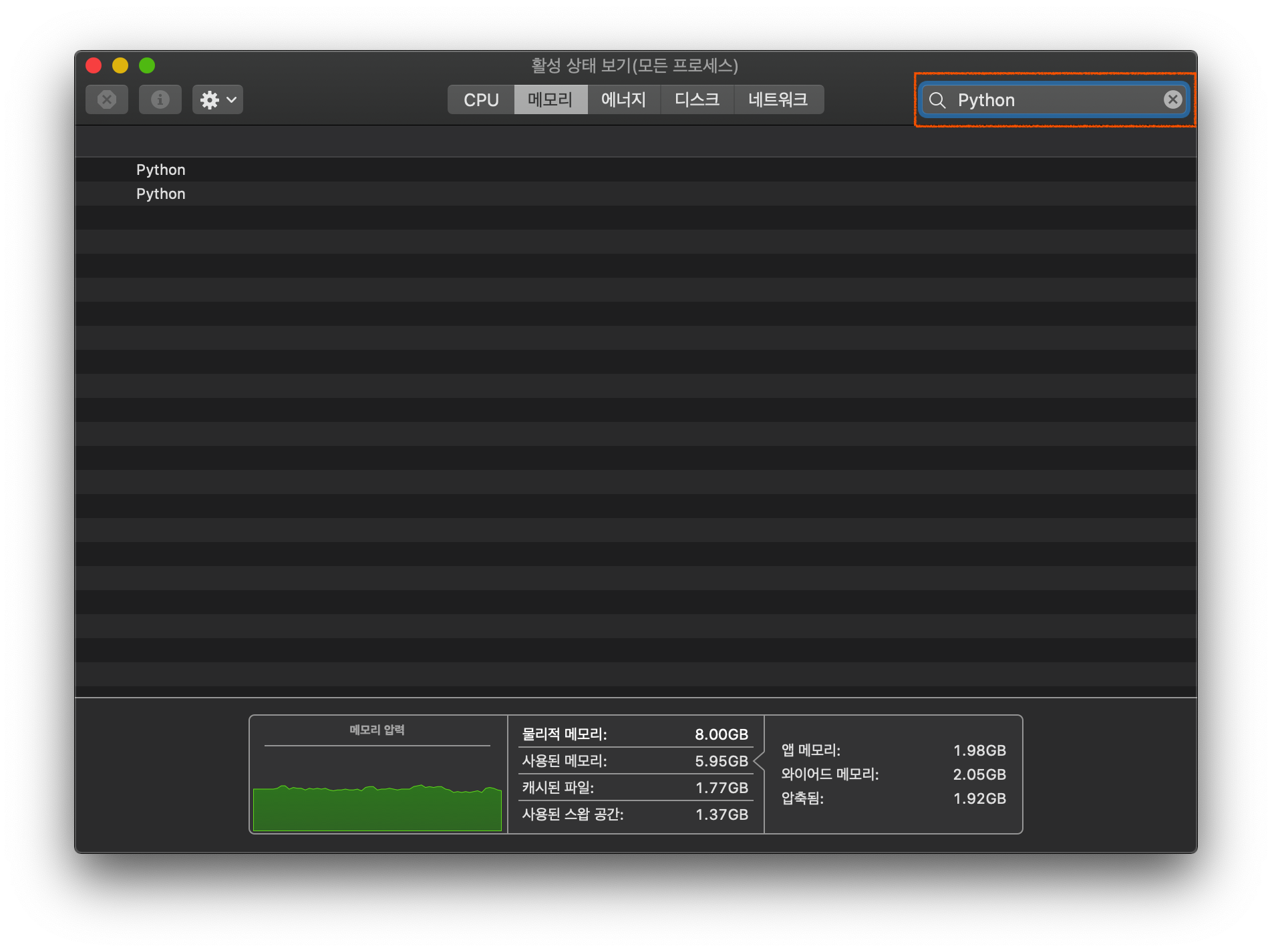 여기서 Python을 검색하면 현재 실행되고 있는 프로세스 2개가 나오게됩니다.