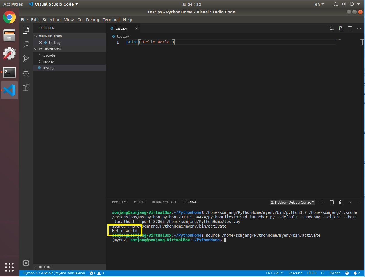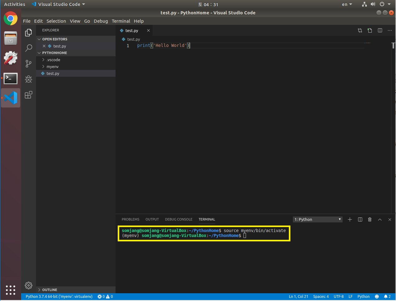 먼저 Visual Studio Code 터미널에서 PythonHome폴더 안에 만들어 두었던 가상환경을 activate 해줍니다.