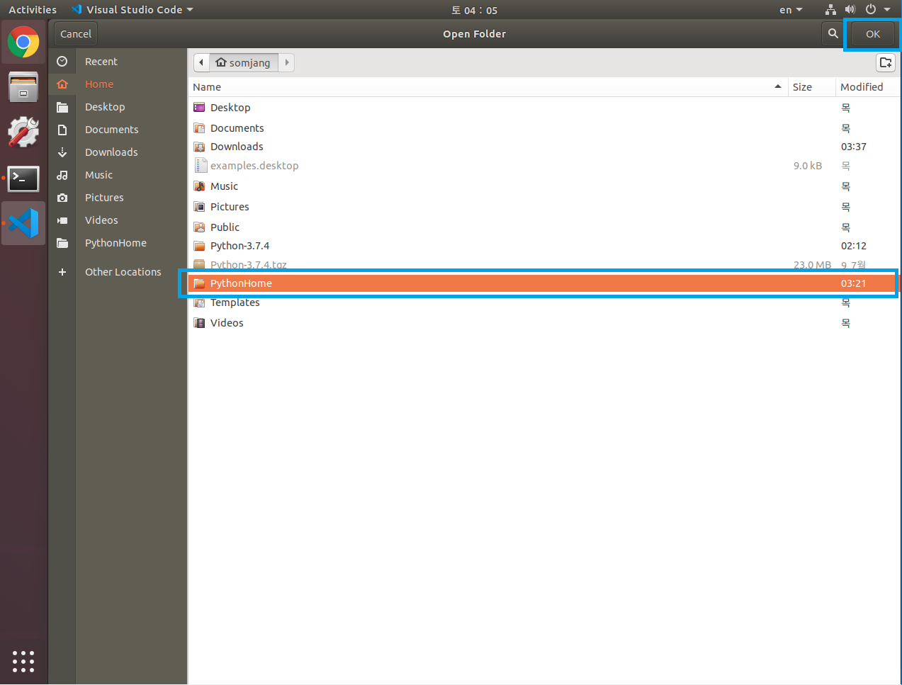 버튼을 클릭해서 미리 가상환경까지 만들어 두었던 PythonHome을 선택해 줍니다.