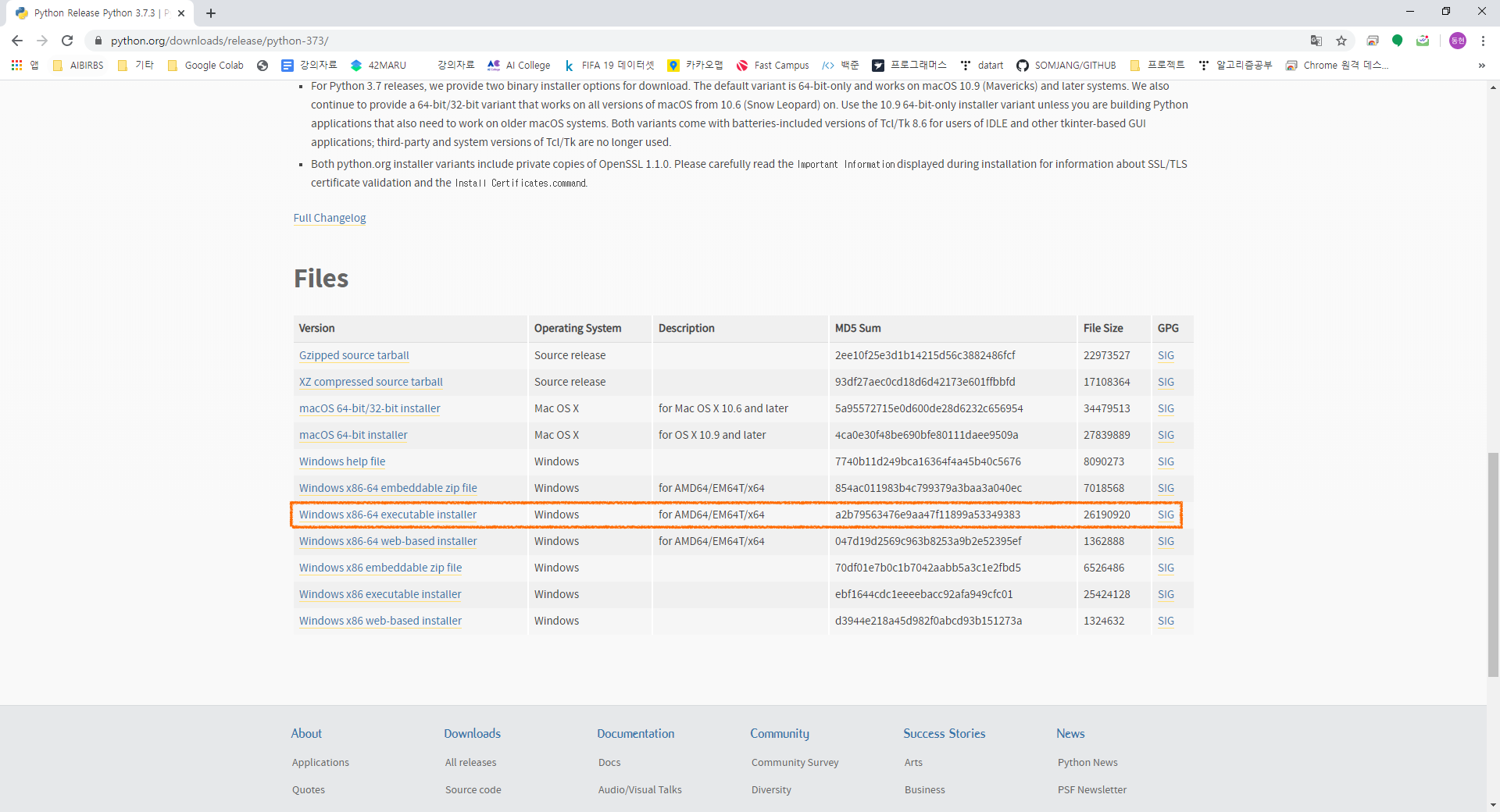 그럼 나오는 이 페이지에서 Windows x86-64 executable installer을 클릭하여 다운로드 받습니다.