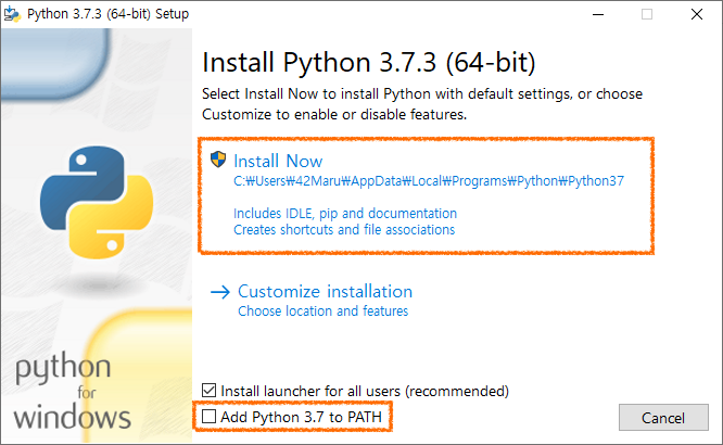 여기서 Python 환경변수를 자동으로 설정하실 분들은 Add Python 3.7 to PATH를 선택하고