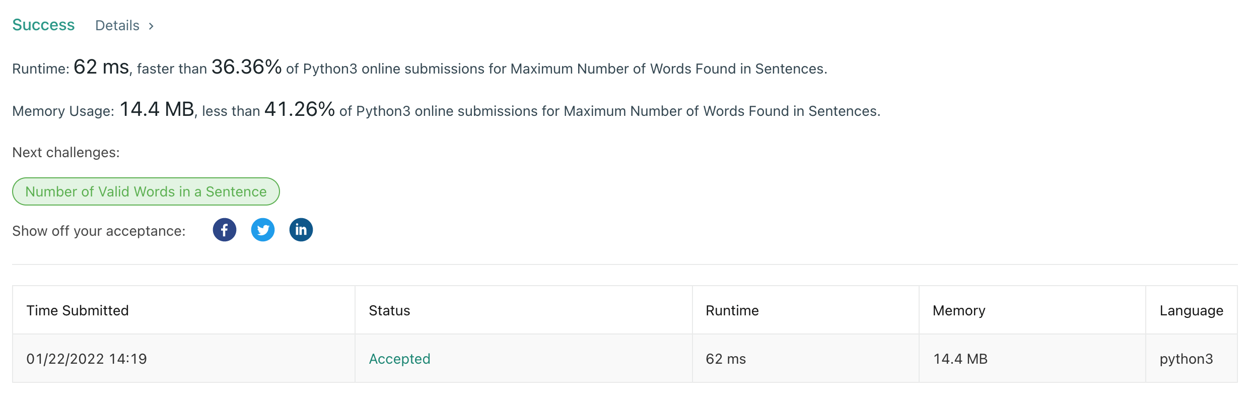 [leetCode] 2114. Maximum Number of Words Found in Sentences (Python) 본문